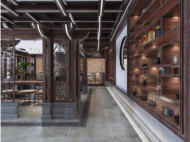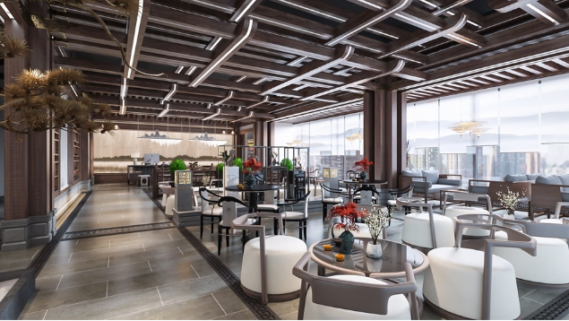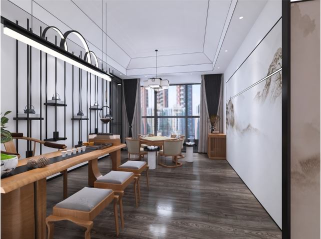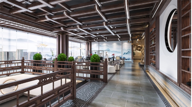 本案是一家中式禪意茶樓,整體風格利用棕色搭配白色色調,來凸顯中式格調,結合古典裝飾元素,來表現中國風。