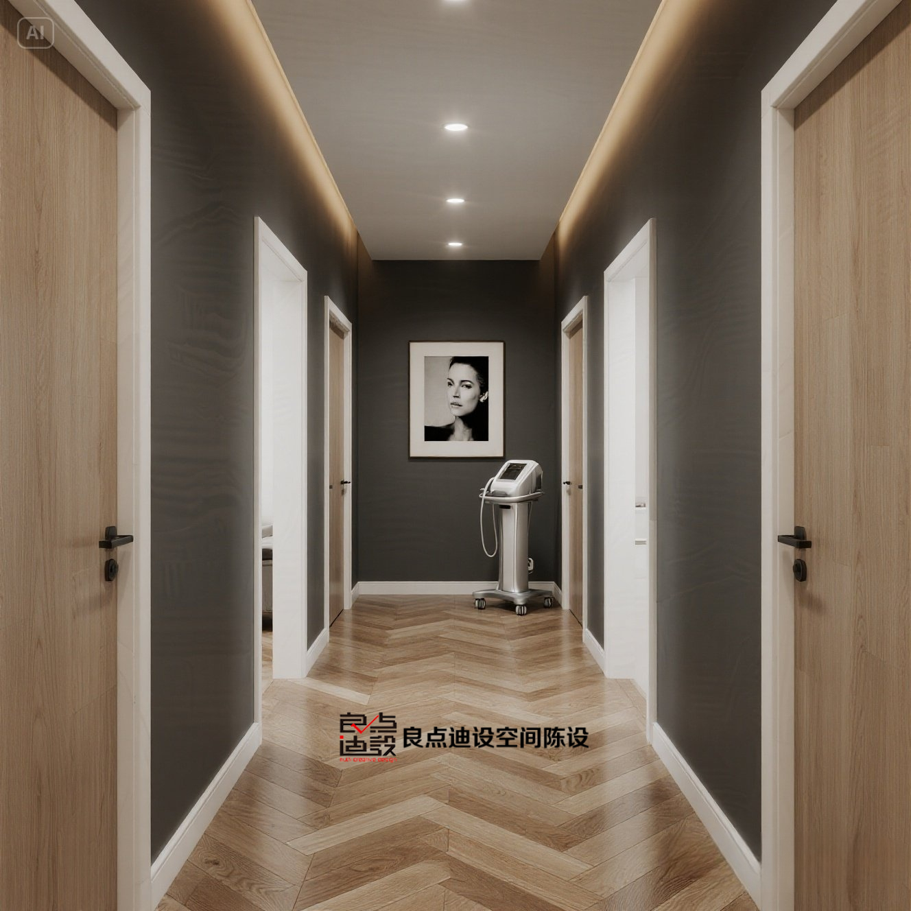 兩邊的木門簡(jiǎn)約又不失格調(diào),跟整體的風(fēng)格超搭。頂上的燈光設(shè)計(jì)也很絕,線性燈和筒燈結(jié)合,既保證了亮度,又營(yíng)造出溫馨又專業(yè)的氛圍。像中間擺著的那臺(tái)美容儀器,在這燈光下,看著就特靠譜。