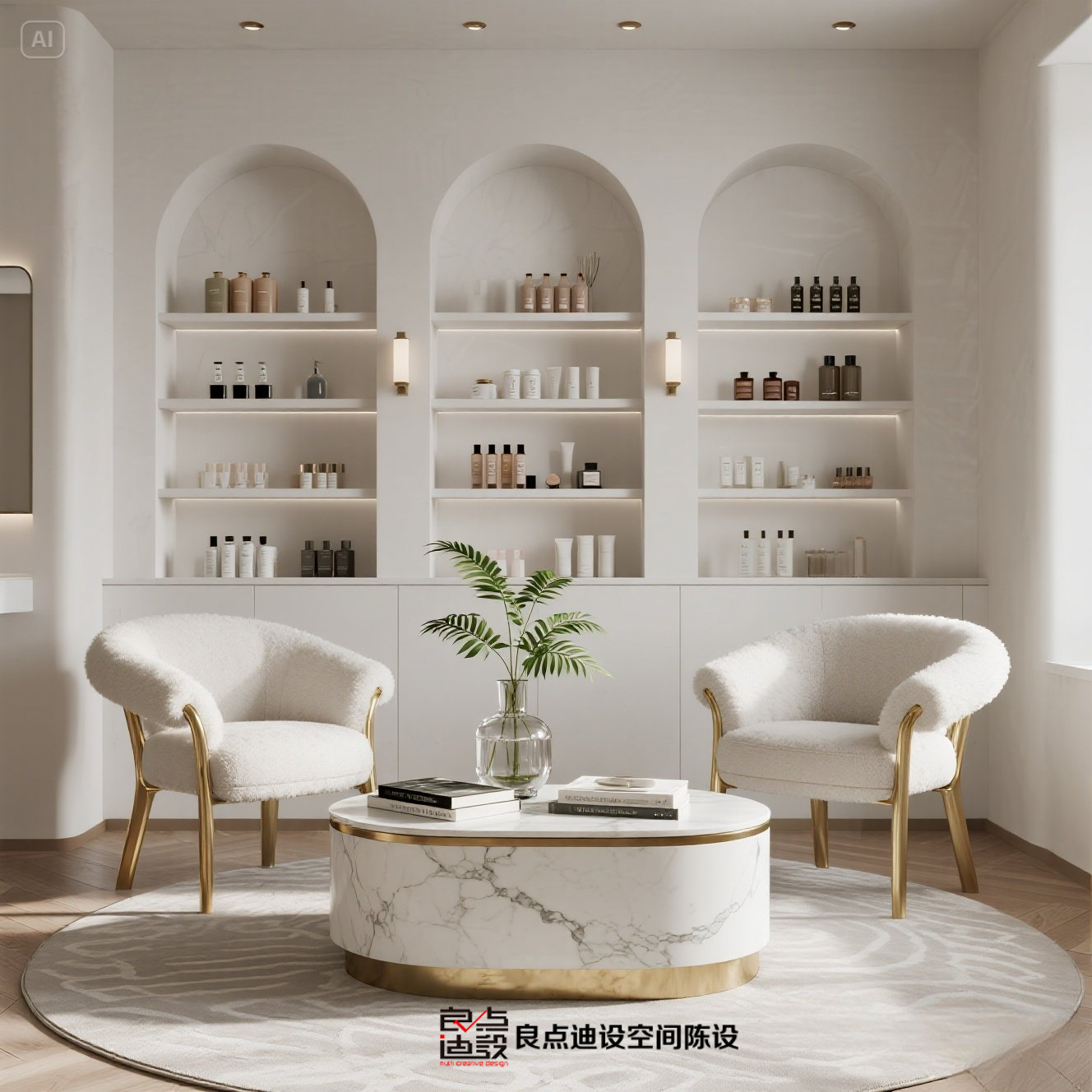 還有這墻面的置物架,拱形設計超有特色。上面整齊地擺放著各種瓶瓶罐罐的護膚品,一目了然又好看。燈光一打,顯得產品特別精致,感覺每一款都在跟顧客招手:“快來試試我~”