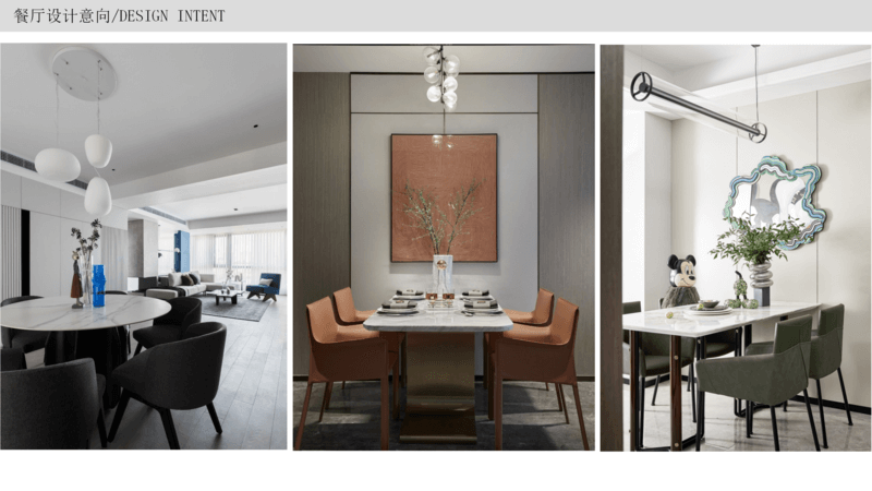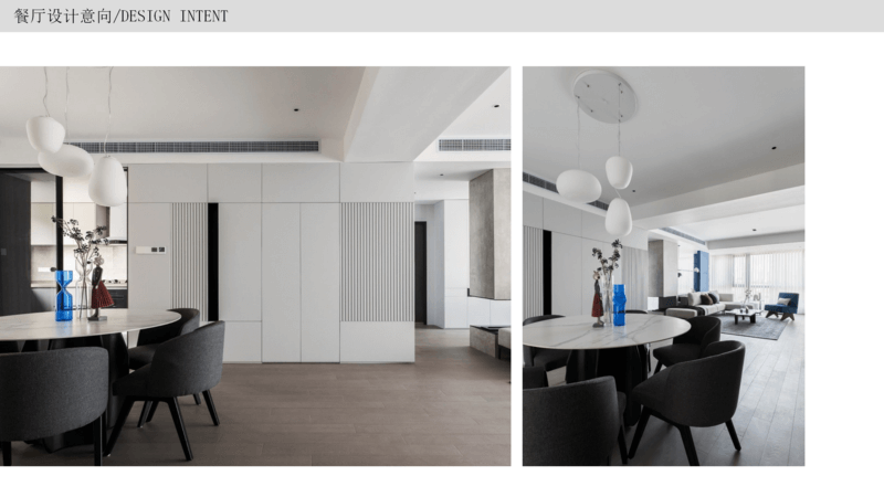 餐廳 延續現代簡約風格,餐桌可以選擇不同的材質來裝飾餐廳,不同的材質其實就會體現出不一樣的氛圍,比如大理石更偏剛硬,木質更偏柔軟,玻璃更偏通透,包括像巖板更偏硬朗,可以根據性格的喜好想要的空間感覺。
