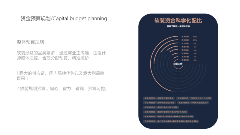 上圖是大概軟裝設計所包括的類目和價值占比,現在精裝房越來越多,而軟裝設計師就是是從整體上綜合策劃裝飾裝修設計方案,體現出居住者的個性品位。