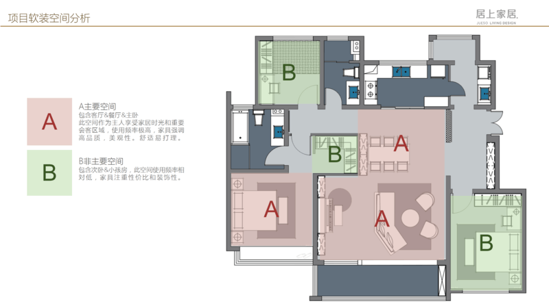 對于整體空間,一定要有主次之分(如上圖),整個空間一定以客廳、門廳、餐廳,同時包括主臥作為整體空間的 主要空間,當然使用頻率相對更高,家具更強調品質和美觀,同時具備舒適性,便于打理。