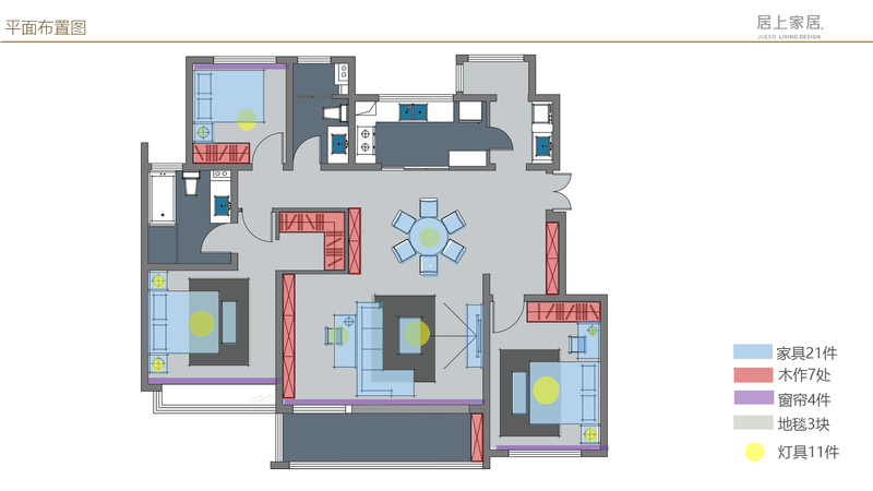 可以看出,以常規布局統籌出來家具、整體定制柜、窗簾、地毯、燈具等需要的數量;
