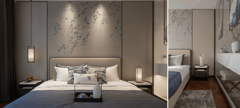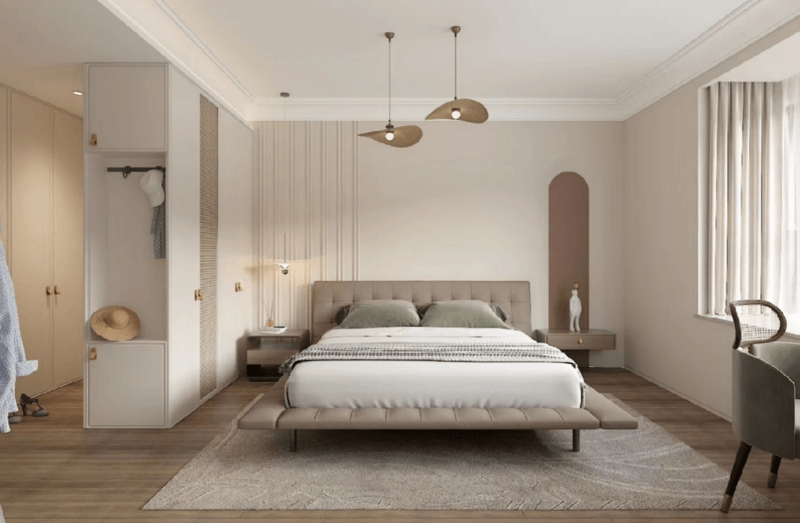 次臥相比主臥要小很多,利用床頭墻面,打造收納+書柜一體化定制床頭柜。打造沉穩、淡雅、溫暖的感覺, 忌過冷、艷、暗、亮。