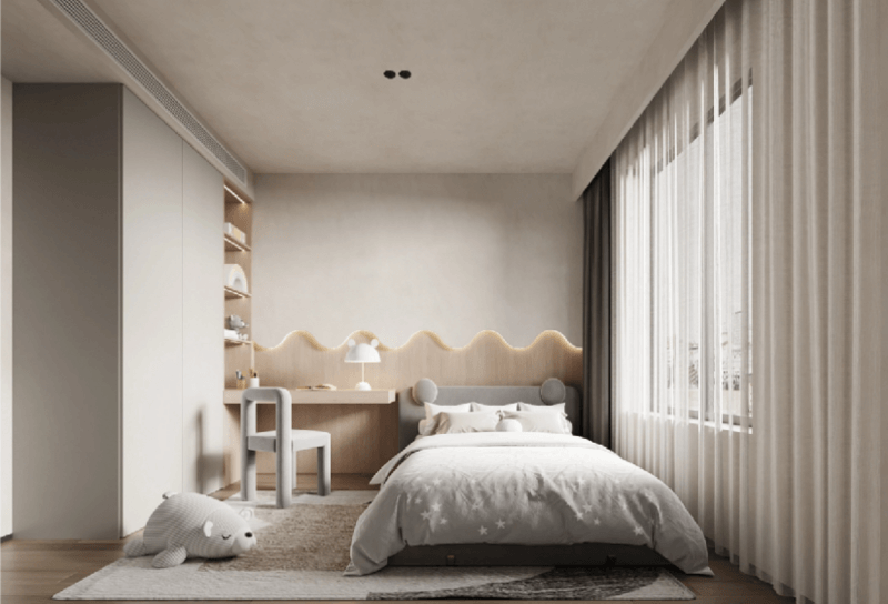 兒童房的設計,除了要營造一種天真爛漫的氛圍外,還需要有休憩功能、學習功能和收納功能;采用一體化的定制形式,將衣柜、書柜、書桌做一體化定制,***大化利用空間的同時,滿足多重需求。