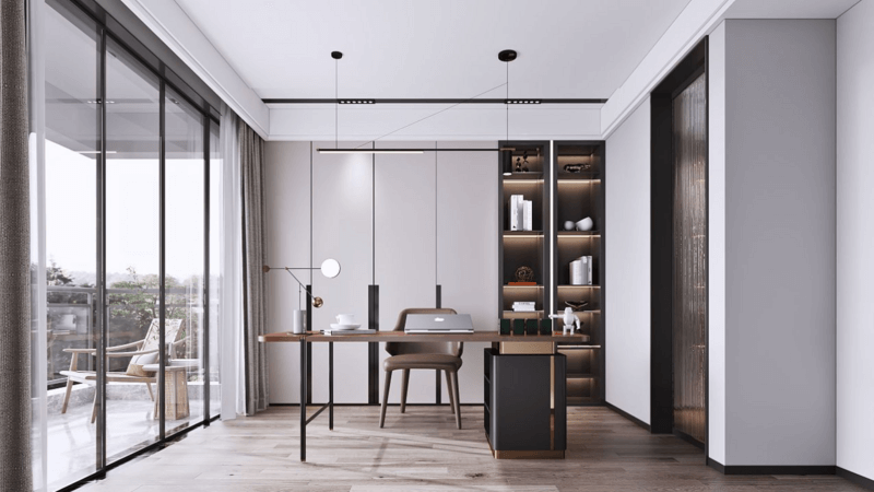 或者只作為獨立書房時需要規劃足夠的收納空間,靠墻定制書桌+書柜,可容納多人使用,便于工作學習。開放式與封閉式并存的書柜,既可以擺放書籍,也可以擺放裝飾品。