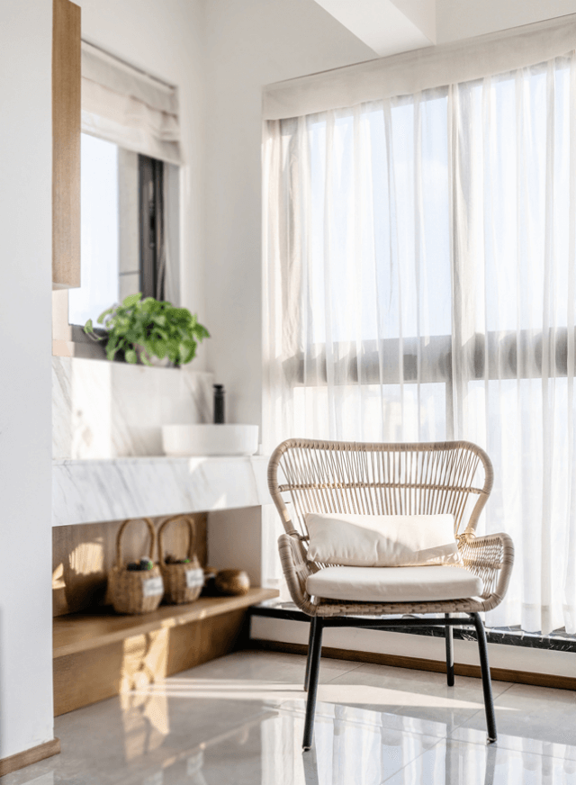北陽臺作休閑使用。綠植、休閑椅、小茶幾構建了一個小而精致的休閑角,是家中難得的放松空間。如果有好友登門也可來這里小坐,兩人喝喝茶、聊聊天,非常悠閑。