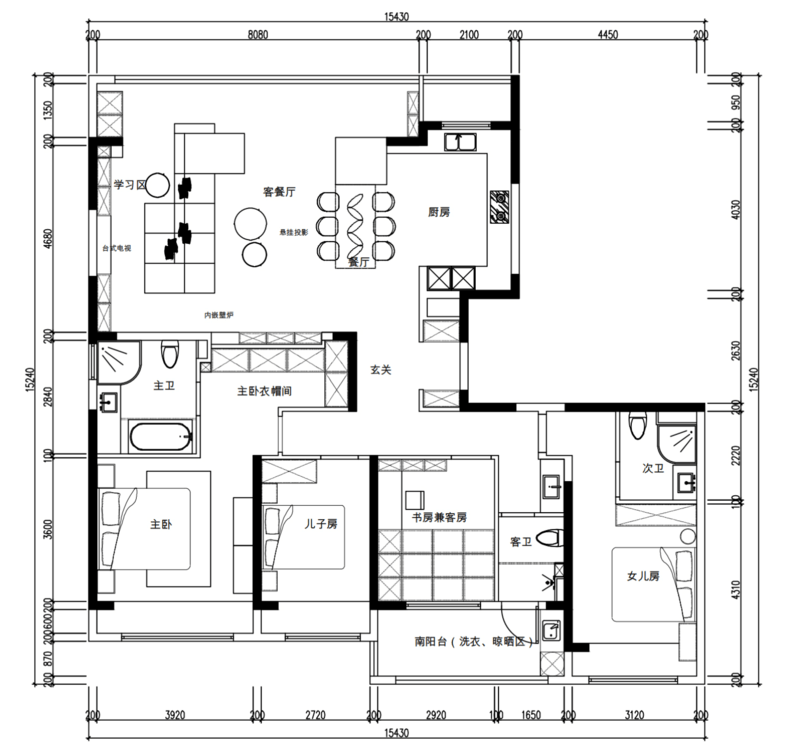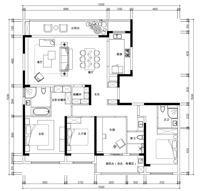 因為這個戶型南北都有陽臺所以南陽臺主要用作洗衣晾曬,北陽臺作為休閑區,種種鮮花綠植等。四個房間均朝南,保留其中三間臥室均帶有飄窗,居住起來比較舒適,兩間作臥室套房,一間為主臥,另一間可以作為長輩房,使用起來更加方便;兒子房靠近書房,臥室比較小,只做基礎的收納和滿足睡眠需求,學習主要在書房完成,提高空間的使用頻率。