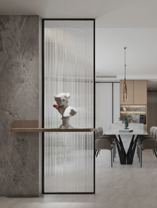 進門看見的是客廳,可以兩邊靠墻做頂天立地式收納柜,打造一個兼具美觀與實用的入戶空間,既能提升家的顏值,又能為家打造一個功能區。如果不考慮儲物,就可以用玻璃作為隔斷。玻璃隔斷不會影響室內采光,還有增加室內通透感的作用。